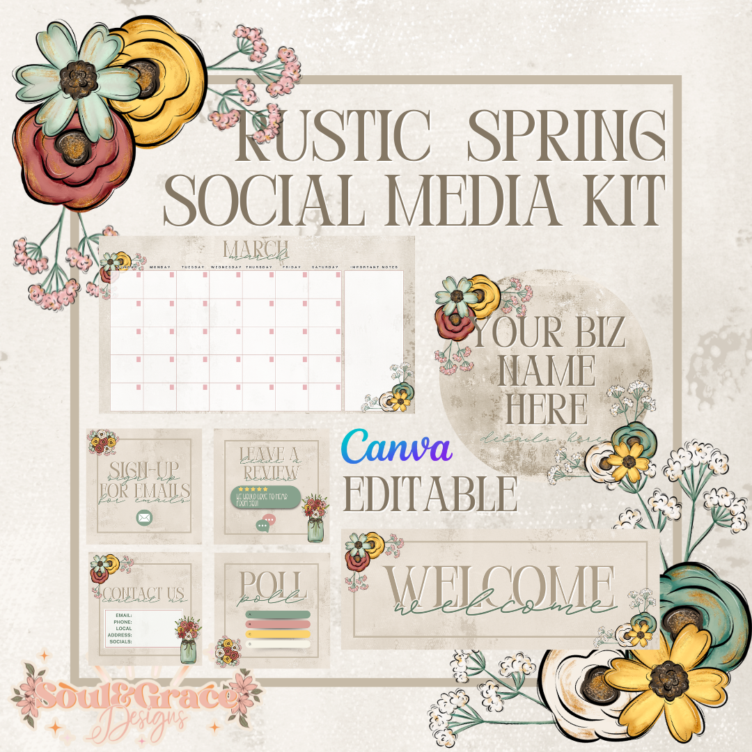 Welcome spring with our Rustic Spring Social Media Kit! Featuring a beautiful mix of neutral tones and delicate florals, this kit will give your brand a cohesive and inviting presence. Elevate your social media game and attract new customers with this must-have kit.